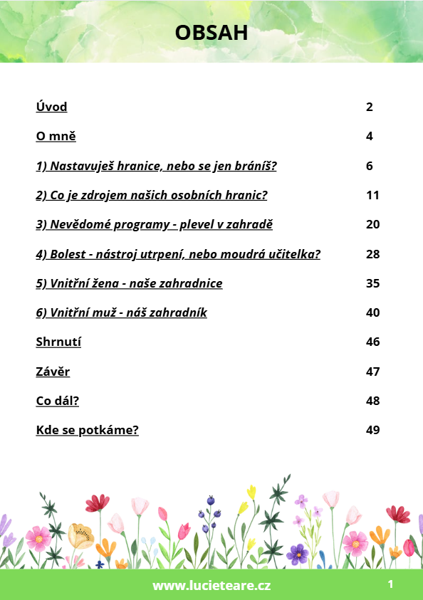 Ruku na srdce… Kdo z nás si umí nastavit jasné hranice, aniž by měl pocit, že tím tak trochu ubližuje sobě nebo druhým? Mám pocit, že tohle se učíme celý život. A pokaždé jinak, podle toho, v jaké jsme zrovna fázi nebo roli. Lucčin eBook nám s tím ale může fakt pomoct. Nejenže je nádherně barevný a plný kytiček, ale hlavně je hluboký a nese důležité poslání… Ukázat, jak si nastavit zdravé hranice, které jsou pevné, ale ne tvrdé… pružné, ale přesto drží. Takové, ve kterých je nám prostě dobře. Mně osobně nejvíc pomohly sebereflexní otázky. Díky nim jsem si uvědomila, jestli svoje hranice stavím z mysli, nebo z vnitřní síly. A metafora vnitřní zahrady? Ta je prostě boží. Doporučuju všem, koho se tohle téma dotýká a kdo má v sobě spoustu otázek. Věřím, že právě tady najde svoje odpovědi.